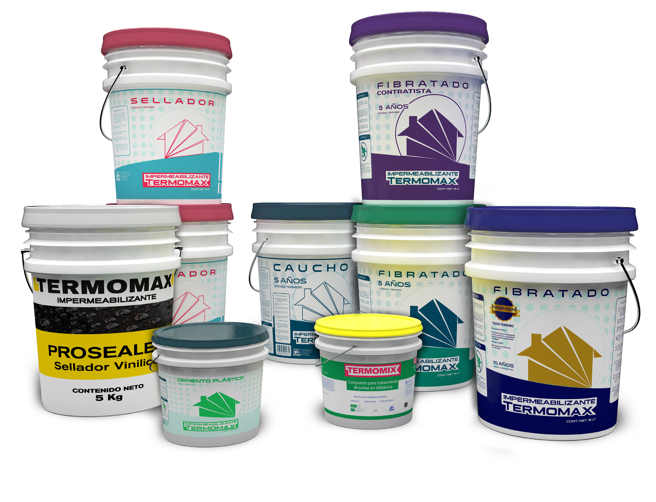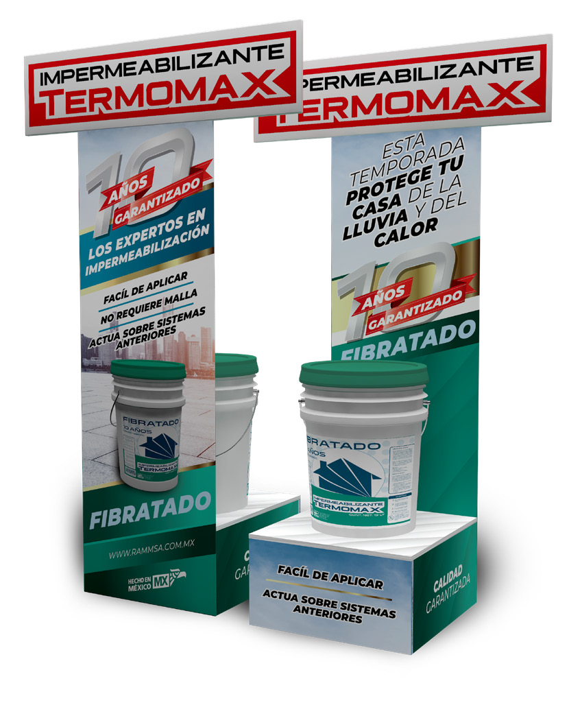 Los impermeabilizantes Termomax se encuentran en presentaciones de 5 años, 10 años y 3 años con refuerzos de fibra y base de resinas elastoméricas que facilitan la elongación. Están diseñados para ambiente extremo (temperaturas sobre 50 grados centígrados y menos 30 grados centígrados). Con aditivos térmicos y antireflejante que resguarda una temperatura fresca dentro del hogar.